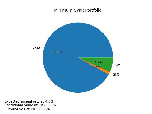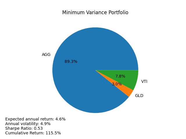 'tickers': {'AGG': 0.89041, 'GLD': 0.05695, 'VTI': 0.05263}},