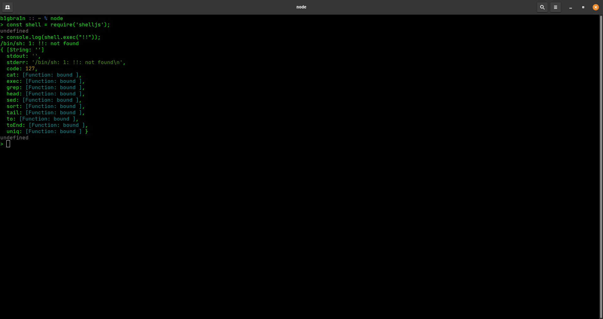 Hi @mufeedvh :), Yep, I can confirm it's not possible completely bypass your fix (good work mate ;)) $ child_process.exec('!!');