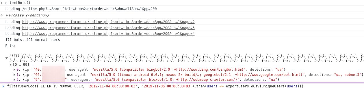 Also it is possible to save the data automatically to IndexedDB every 20 minutes (vBulletin keeps all clients in this list for 30 minutes after the last page request) and later filter, export to CSV.