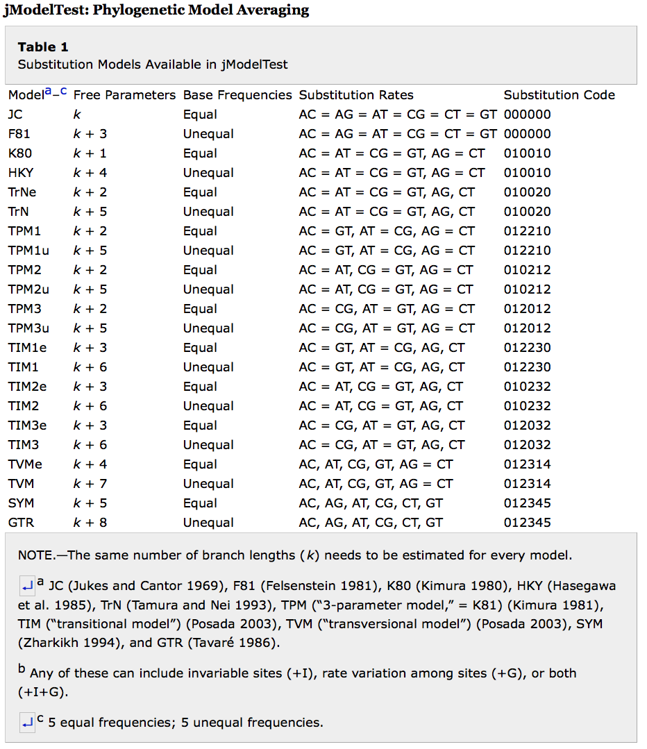 They are summarised in Table 1 in jModelTest (Posada 2008):