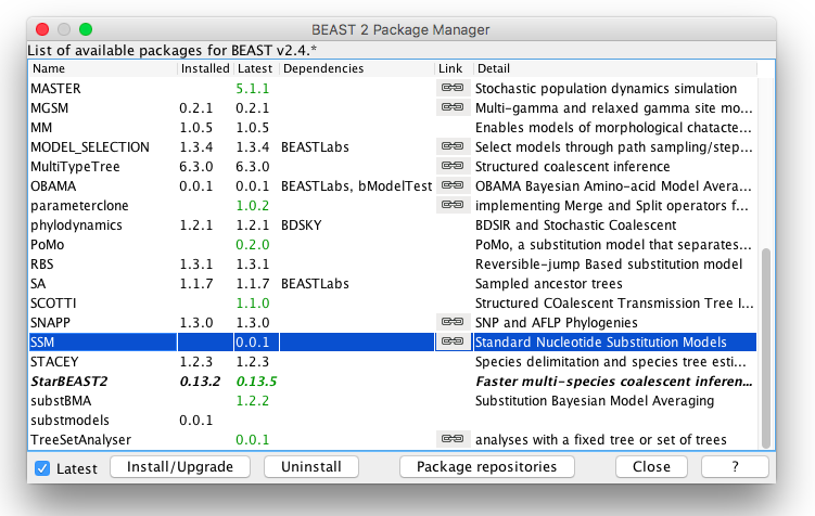 To install SSM, it is easiest to start BEAUti (a program that is part of BEAST), and select the menu File/Manage packages. A package manager dialog pops up, that looks something like this: