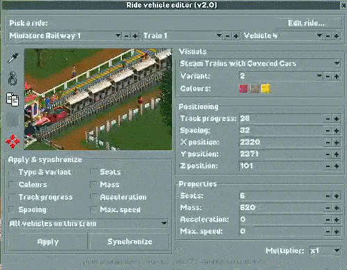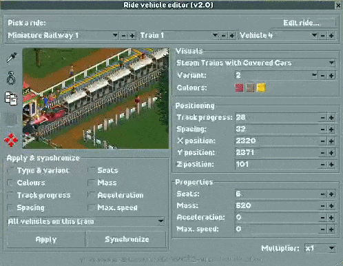 This plugin lets you edit vehicles on any ride in your park on the fly.