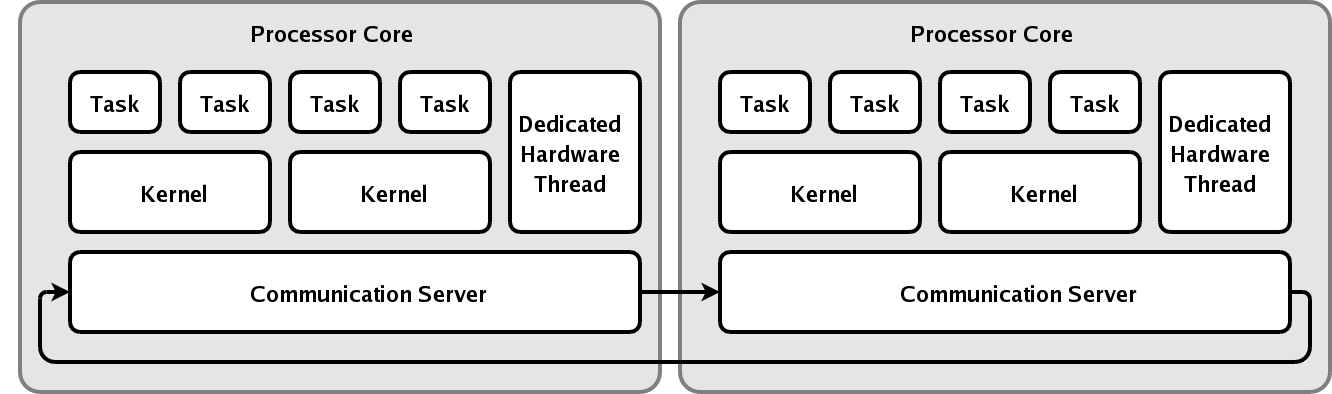 xTask is a distributed Operating System for the XMOS XS1 multi-core microprocessor architecture. Each processor core of the XMOS XS1 architecture supports up to eight hardware threads. Multiple processor cores can be interconnected by high speed on-chip or off-chip processor buses. The xTask Operating System allows to run multiple tasks within a single hardware thread under supervision of a kernel that manages the resources available to a hardware thread such as the processor time. Multiple hardware threads can be configured to run multiple tasks on each of them. These hardware threads can be located on the same processor core or another. Each hardware thread that runs multiple tasks under supervision of a kernel is connected to a Communication Server. Each processor core has a Communication Server and all Communication Servers are connected with one another by means of a ring bus, enabling communication throughout the system. Tasks can create dedicated hardware threads and communicate with it indirectly through virtual channels managed by the Communication Server. Tasks can also communicate with one another, it does not matter whether the two tasks are managed by the same kernel, different kernels on the same processor core or on different kernels on different processor cores.
