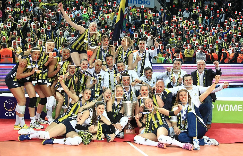 The performance of RetinaFace is very satisfactory even in the crowd as seen in the following illustration. Besides, it comes with an incredible facial landmark detection performance. Highlighted red points show some facial landmarks such as eyes, nose and mouth. That's why, alignment score of RetinaFace is high as well.