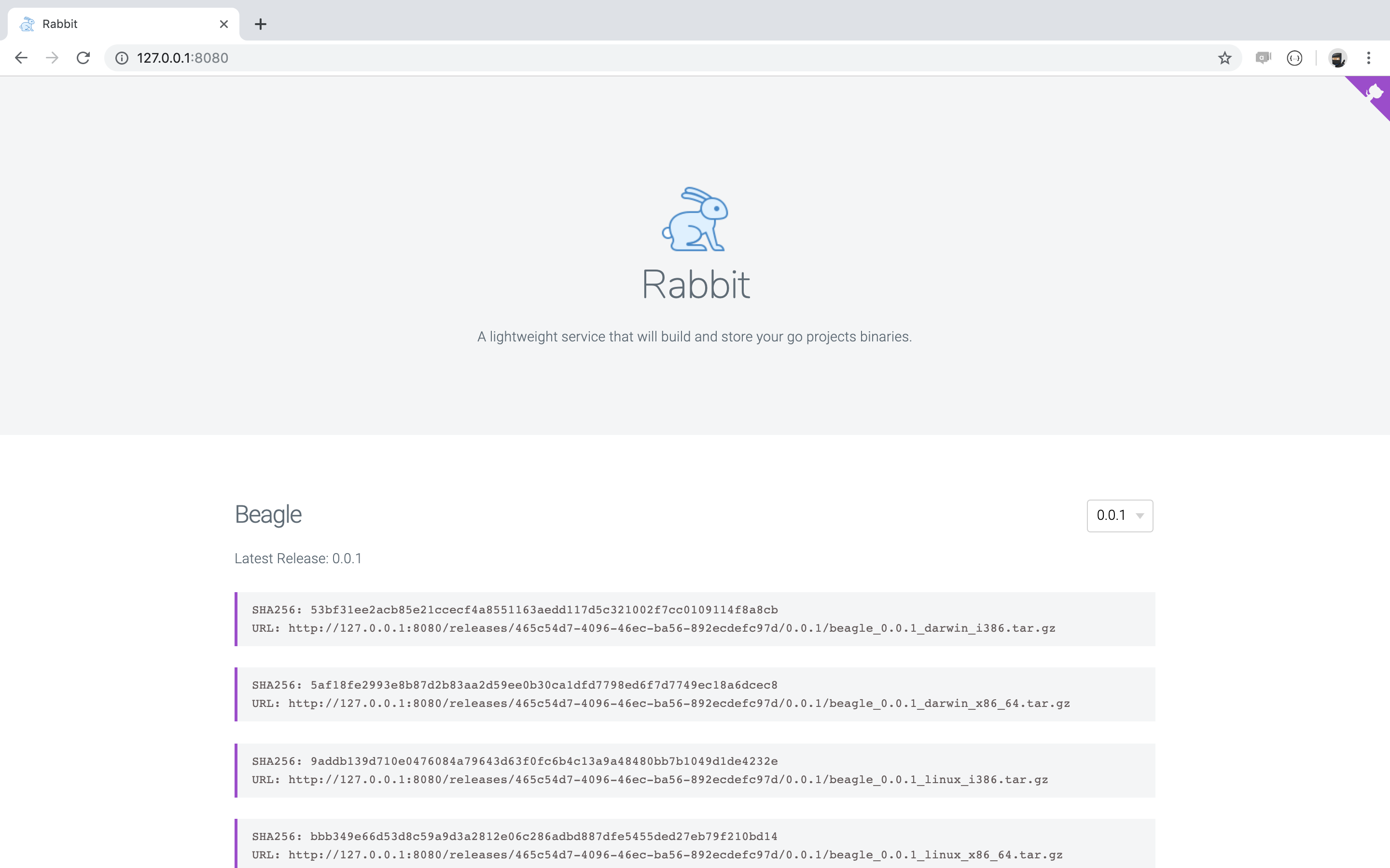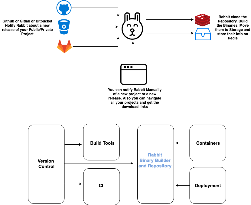 Rabbit is a lightweight service that will build and store your go projects binaries. Once a VCS system (Github, Gitlab, Bitbucket or Bitbucket Server) notifies rabbit of a new release, it clones the project, builds different binaries and publishes them.