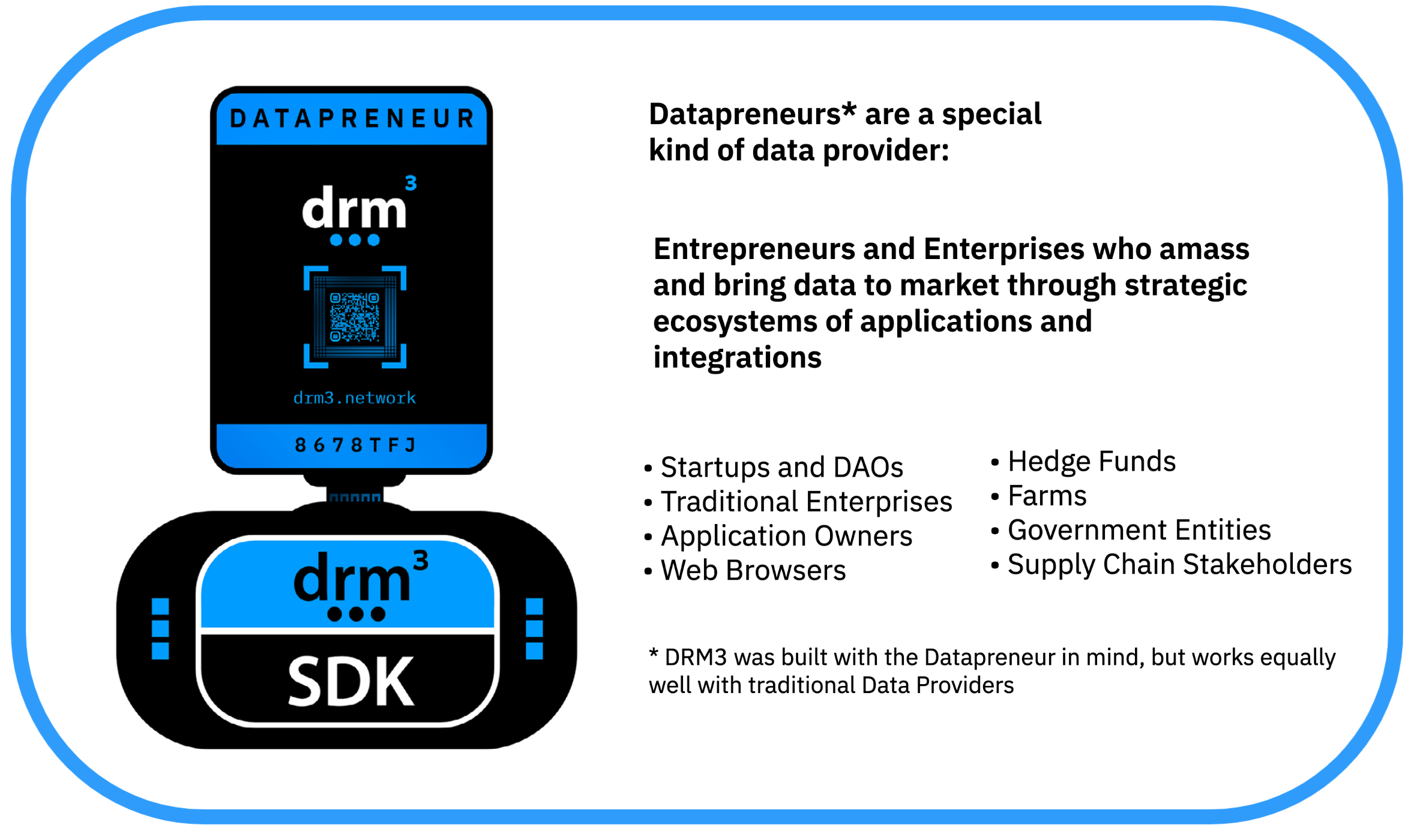 At DRM3, we are passionate about unlocking the potential of user-generated data by creating an equitable and beneficial ecosystem that is fair to all stakeholders. We strive to empower Data Providers and Data Producers to take control of their data, realize its full value, and receive market-rate compensation for its use.