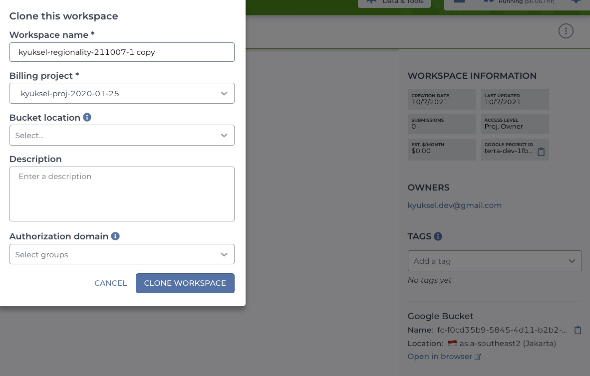 Ok! I think I understand the issue. When WorkspaceContainer is first mounted it makes one api call to GCS for the bucket location. But if you do something that calls wrapWorkspace (such as navigating to a different tab, for example), it re-renders WorkspaceContainer but doesn't keep the old state. So when you opened the ComputeModal, you now opened it with the default location instead of the actual location. So the fix I pushed copies how WorkspaceContainer caches the workspace data. I create a new store for the bucket location, and fetch it when re-rendering WorkspaceContainer. |