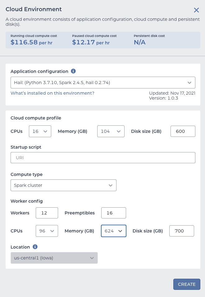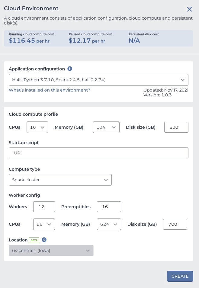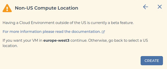 CUSTOMIZE. The location dropdown should be enabled and should have two choices - the bucket region and the US.If you create the environment in the non-US region, you should see this warning: