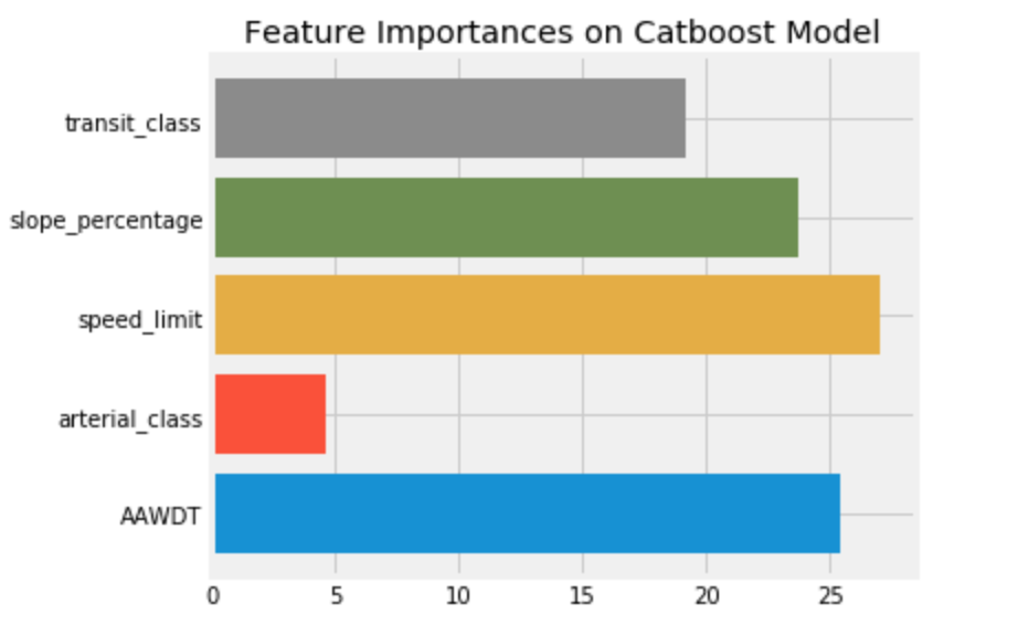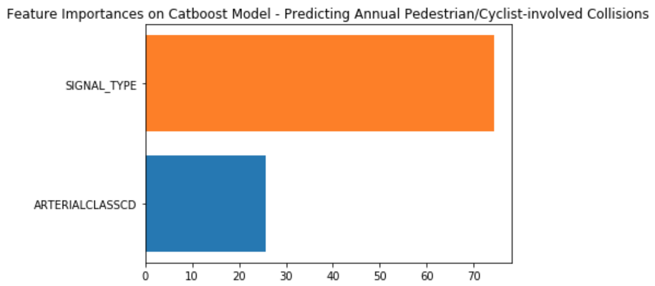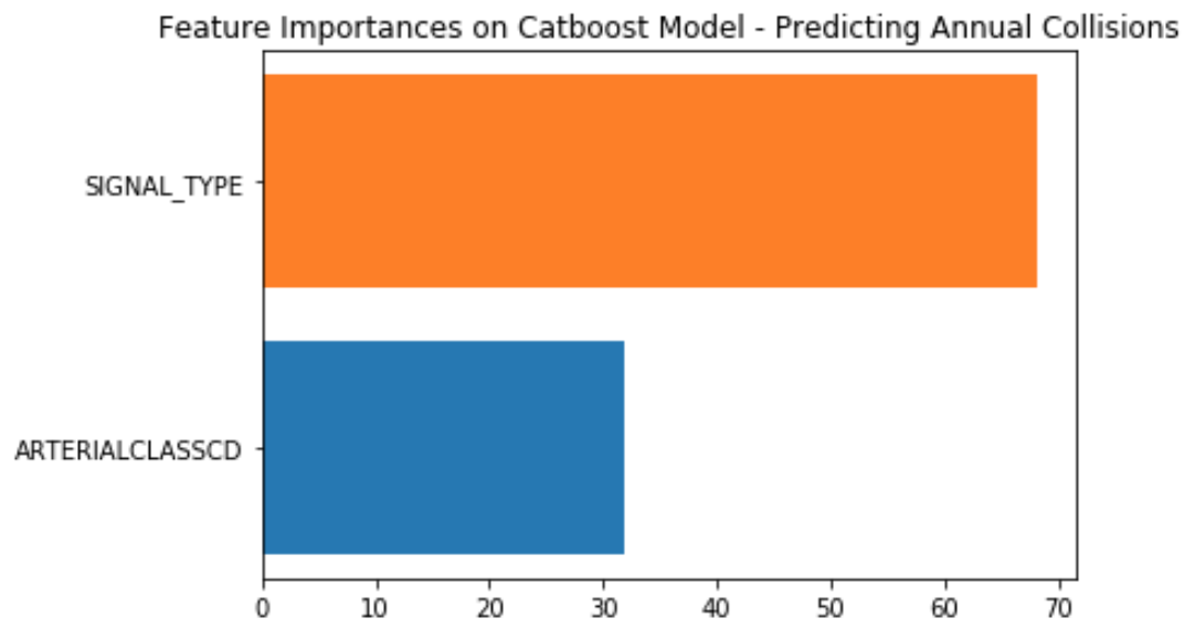 Our second approach was to aggregate annual collision counts on the Seattle Streets and Intersections datasest and apply machine learning to predict annual number of accidents on meta features: transit class, slope percentage, speed limit, arterial class and average daily traffic counts for streets; signal type, arterial class and traffic circle (yes/no) for intersections. We used CatBoost for these models because it's Gradient Boosted Random Forest Algorithm is similar to LightGBM but it can handle strings categorically (LightGBM can only interpret integers). It's important to note that the Streets dataset contains multiple iterations of many streets (i.e. 1st Ave N between Broadway and Cherry, 1st Ave N between Pine and Yesler). We did not determine the time it would talk to meticulously map each collision to a particular street segment was a constructive use of time considering all other ML problems in the data, so the median values of the aforementioned features were taken for each named street. The intersections data does not have the same problem, but there are fewer features to study. Ultimately this effort was meant to inform further data analysis and supplement findings therein as the algorithm itself lends little to shape policy.