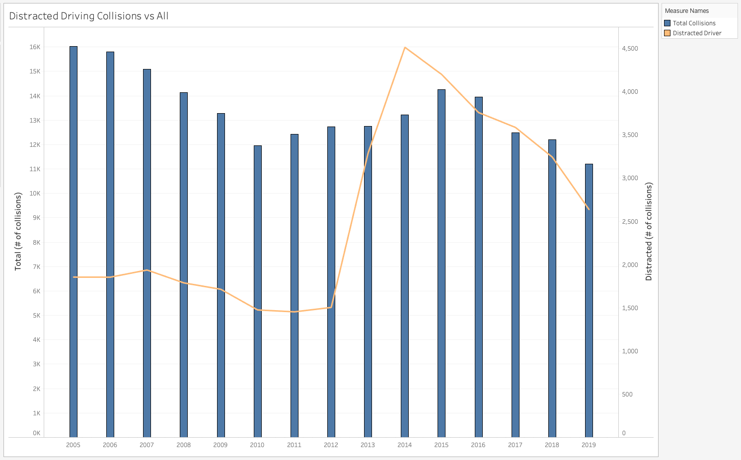 The dramatic increase in reported collisions with distracted drivers from 2013-15 points to a common theme in the data quality available to us - how much are the features being influenced by external forces or simple human error? Our research was inconclusive but it's possible that the sudden rise in collisions related to distracted driving has more to do with police aggresively investigating cases or casting a wider net to include such cases.