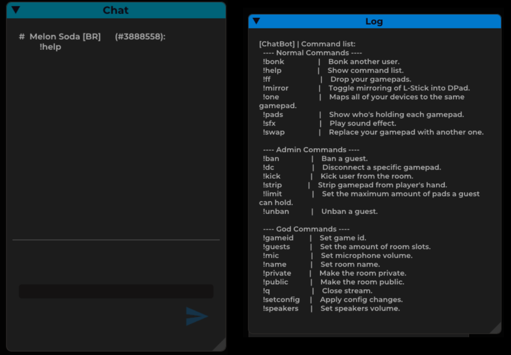 - Role tiers for chatbot commands. Guests have their own set of commands like "pick a specific gamepad", "drop gamepad" and "play sound effect". And admins can ban/unban guests from chat commands.