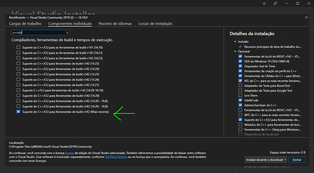 - You may need to install the C++/CLI build tools support package from the individual components tab.
