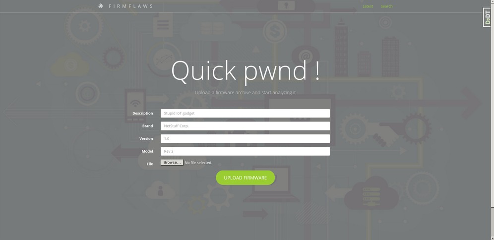 Upload firmware and run static analysis (parse firmware, grep strings, search for interesting files (conf, certs, db files...), etc.).
