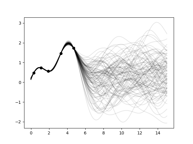 For better visualization, we will condition a 1d field to a few "measurements", generate 100 realizations and plot them: