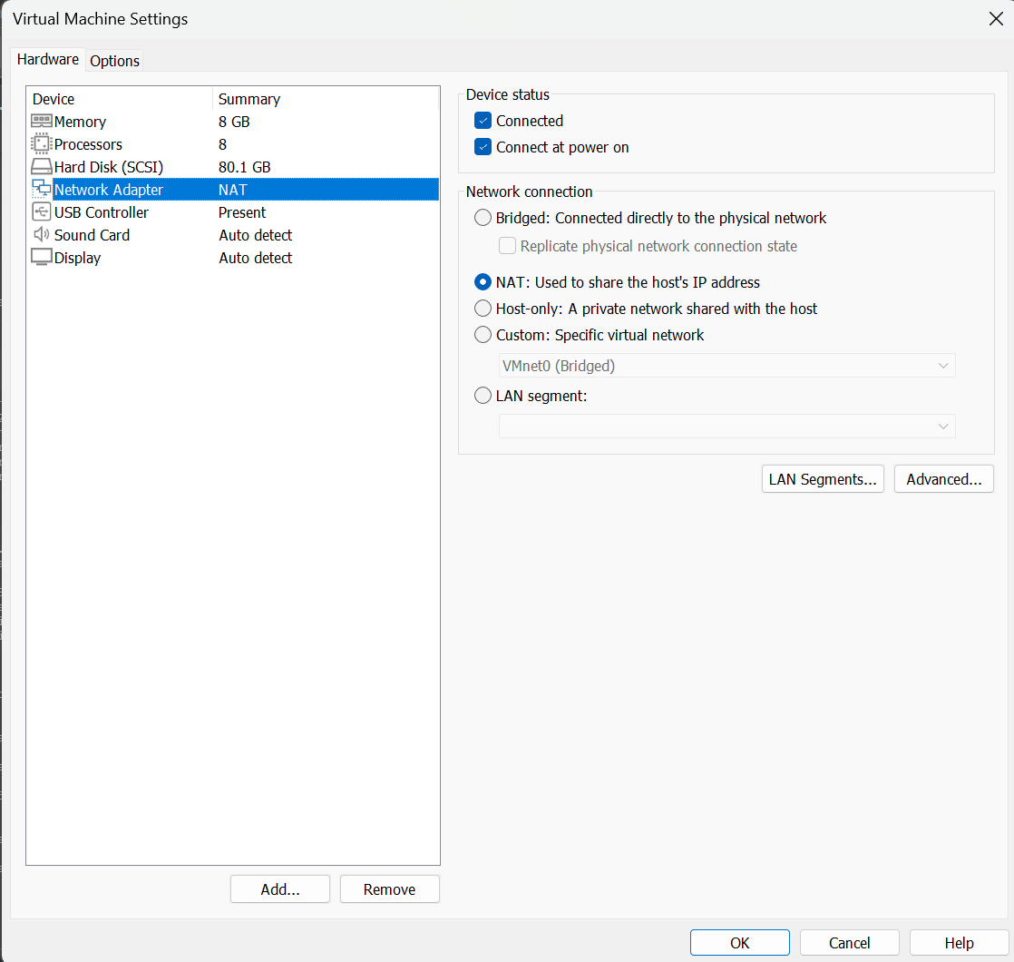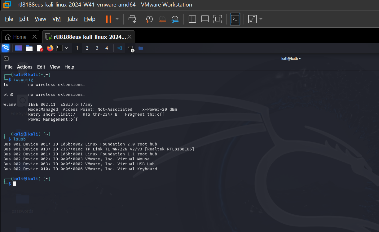 如果你透過執行「lsusb」看到該設備名稱,但沒有看到它出現在「iwconfig」中,請重複執行上述步驟,或檢查下方的網路設定。如果執行了多次但仍看不到該設備,請重新啟動虛擬機器。