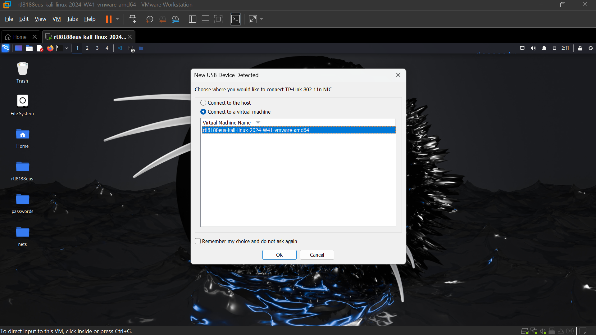 當 usb 裝置插入時,這個視窗將會彈出。選擇 Connect to Virtual machine > 選擇目標虛擬機器。
