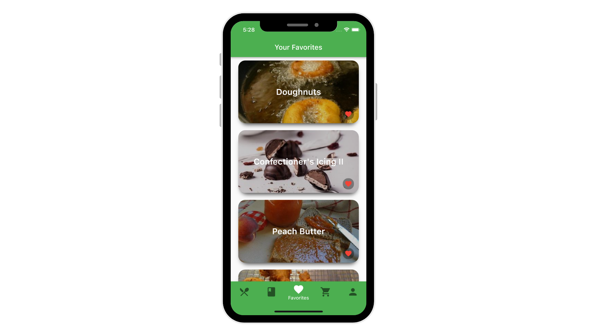 Throughout the application, the recipe tiles will have a small heart icon on the bottom right. To favorite a recipe, press this button and the state of your Favorites page will update to reflect this change. Likewise, you can also unfavorite a recipe. The ability to favorite recipes is only available after signing in.
