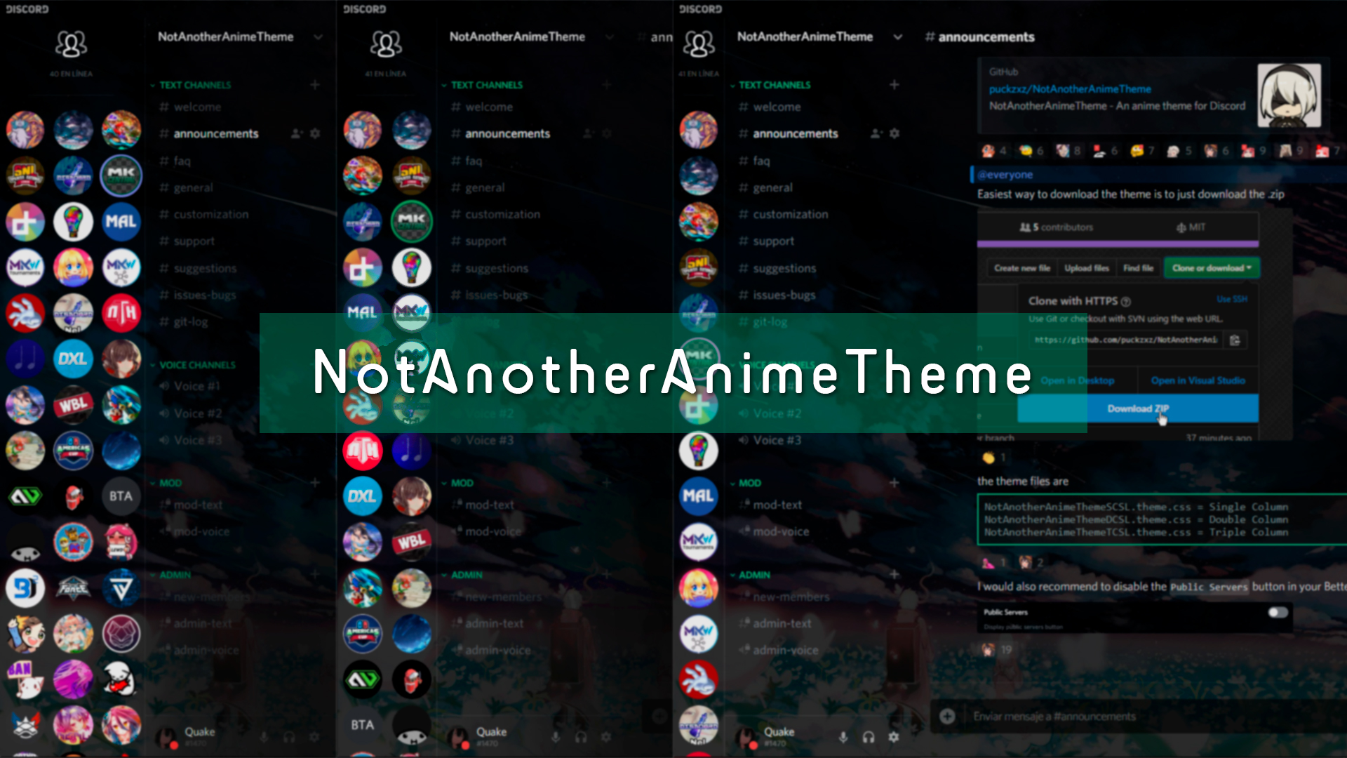 NotAnotherAnimeTheme is a highly customizable theme for Discord (with BetterDiscord or Powercord) allowing for a revitalized and fresh take on the Discord UI. Every part of the theme is customizable, from the background image to the scroll bar colors. The user has full control over the default configuration. Preview pictures can be found here.