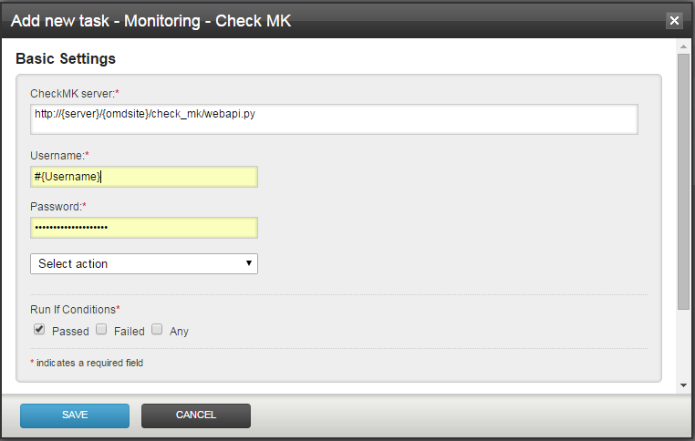 - CheckMK server - url of the Check_MK monitoring server (i.e http://{server}/{omdsite}/check_mk/webapi.py); the url does not need to be ended in a "/"