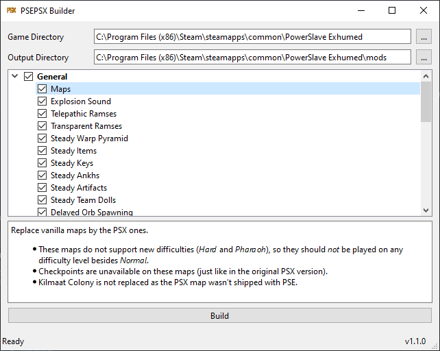 PSEPSX is a mod builder and a mod itself for PowerSlave Exhumed that aims to provide various in-game changes to bring the game a bit closer to the PlayStation version.
