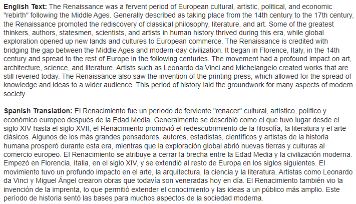 Translation: Translation models convert text from one language to another, enabling cross-lingual communication and content localization. They can also be used for tasks such as speech-to-text and text-to-speech conversion.