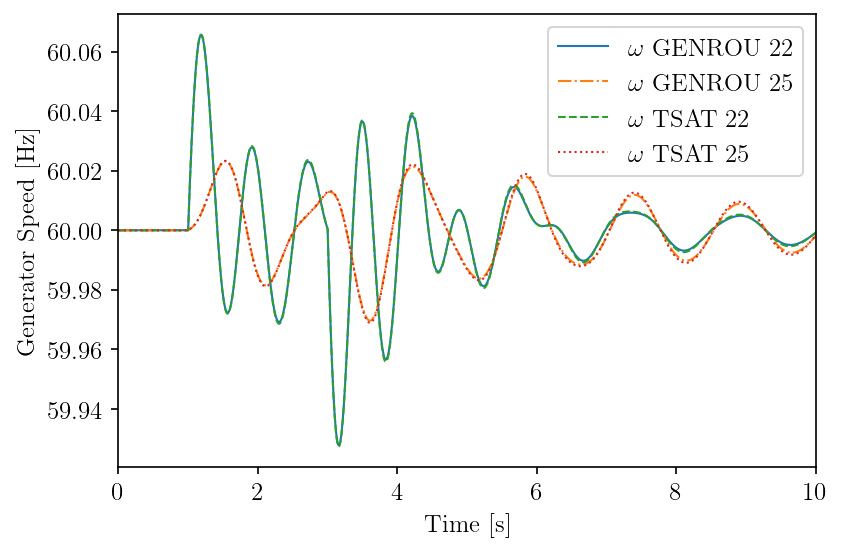 For the Northeast Power Coordinating Council (NPCC) 140-bus system (with GENROU, GENCLS, TGOV1 and IEEEX1), ANDES results match perfectly with that from TSAT.