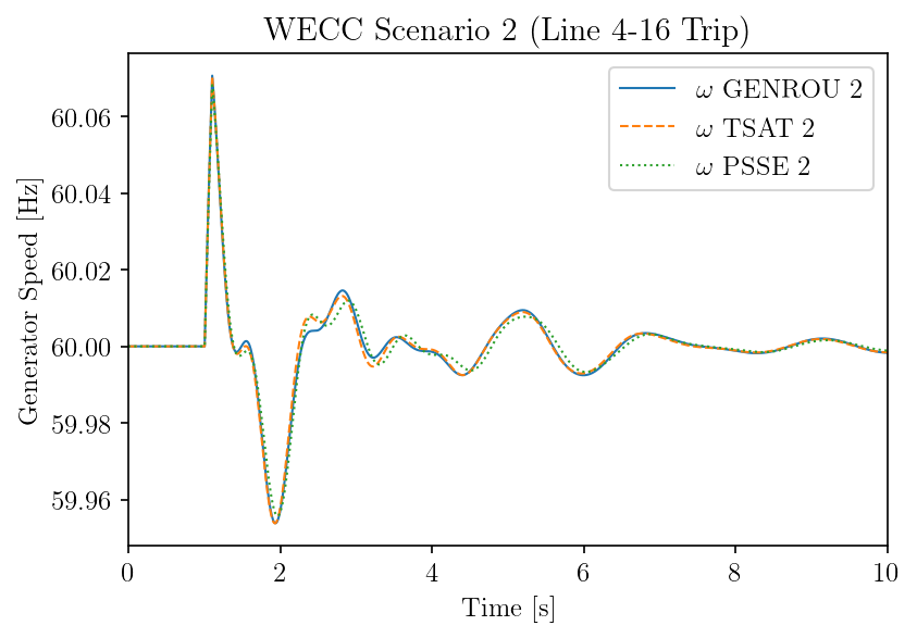 For the Western Electricity Coordinating Council (WECC) 179-bus system (with GENROU, IEEEG1, EXST1, ESST3A, ESDC2A, IEEEST and ST2CUT), ANDES results match closely with those from TSAT and PSS/E. Note that TSAT and PSS/E results are not identical, either.
