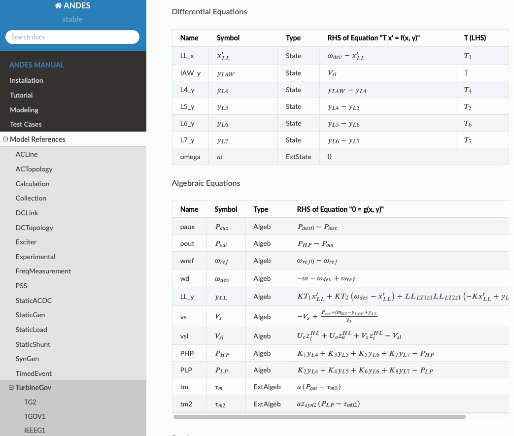 In ANDES, what you simulate is what you document. ANDES automatically generates model documentation, and the docs always stay up to date. The screenshot below is the generated documentation for the implemented IEEEG1 model.