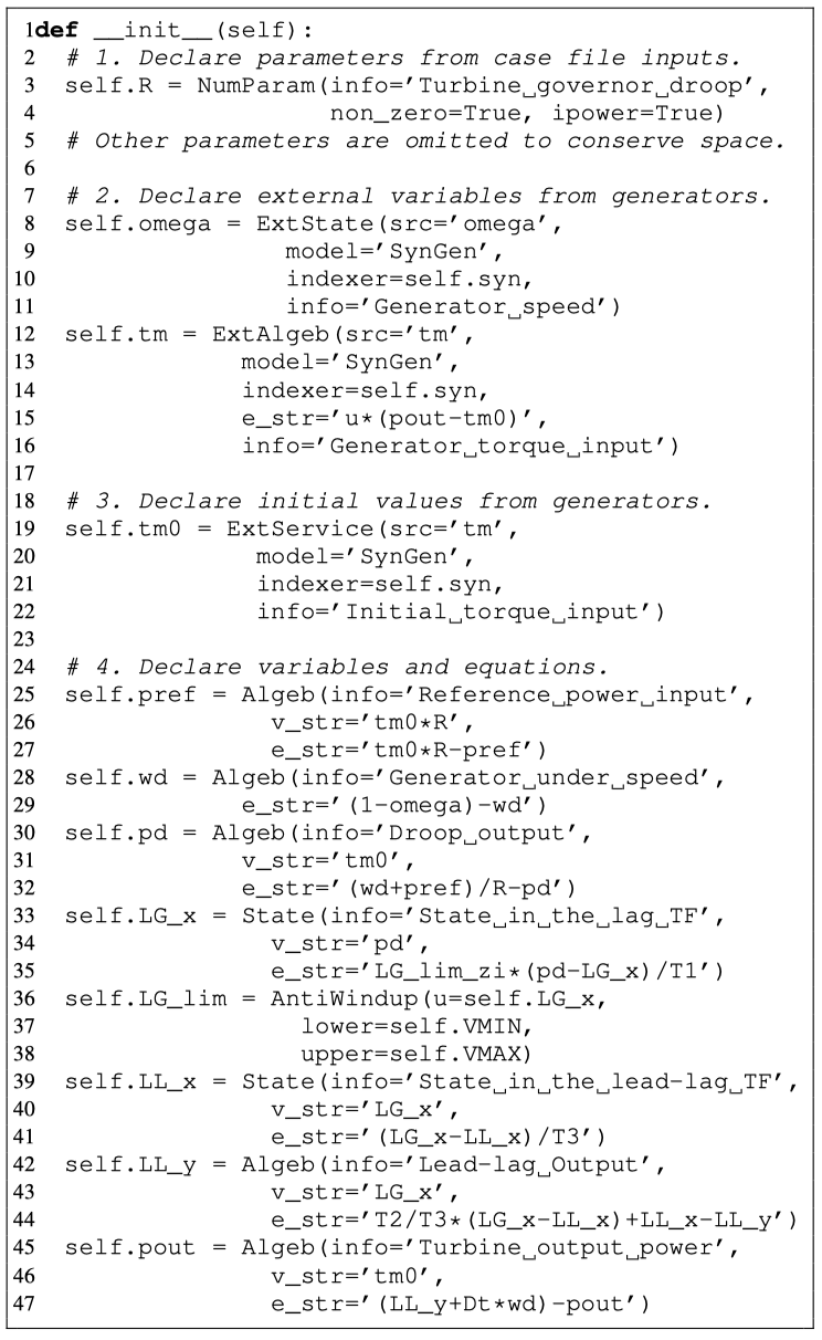 ANDES provides a descriptive modeling framework in a scripting environment. Modeling DAE-based devices is as simple as describing the mathematical equations. Numerical code will be automatically generated for fast simulation.