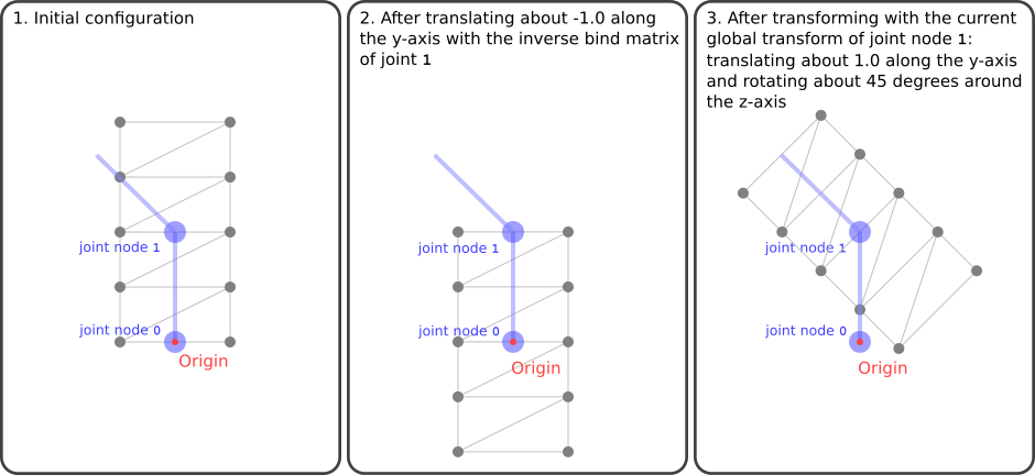 inverseBindMatrices? (I wondered whether this might mean that the inverse bind matrix of the parent node should actually be the identity matrix, and only the inverse bind matrix of the child node should contain the-1translation in y-direction. I could just "try out whether this works in most viewers", but there has been so much back and forth that I'm increasingly hesitant to do this. Maybe someone with a deeper understanding can make a definite statement here...