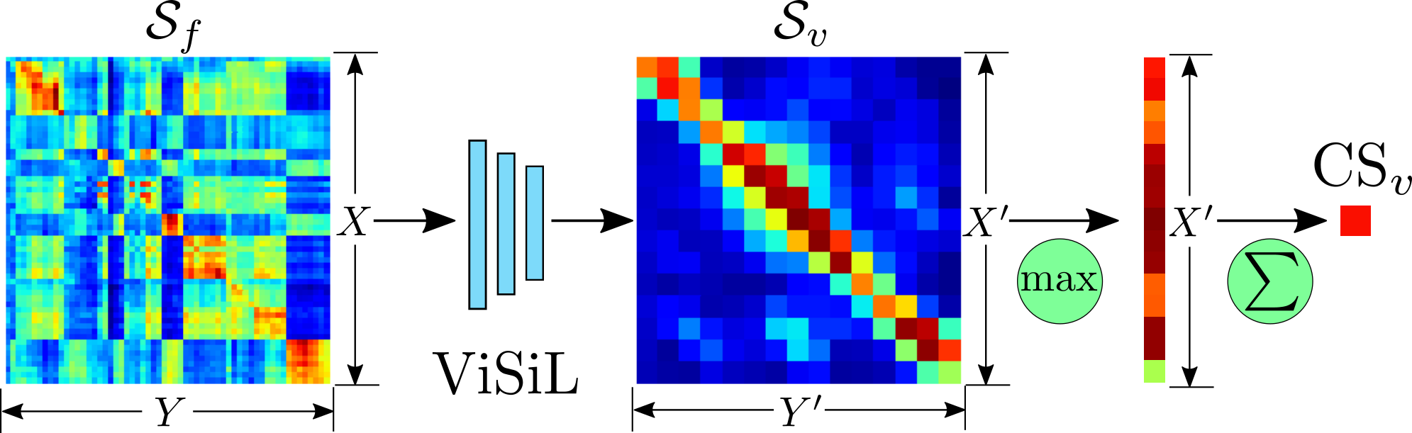 This repository contains the Tensorflow implementation of the paper ViSiL: Fine-grained Spatio-Temporal Video Similarity Learning. It provides code for the calculation of similarities between the query and database videos given by the user. Also, it contains an evaluation script to reproduce the results of the paper. The video similarity calculation is achieved by applying a frame-to-frame function that respects the spatial within-frame structure of videos and a learned video-to-video similarity function that also considers the temporal structure of videos.