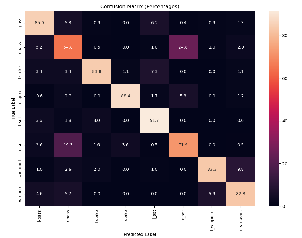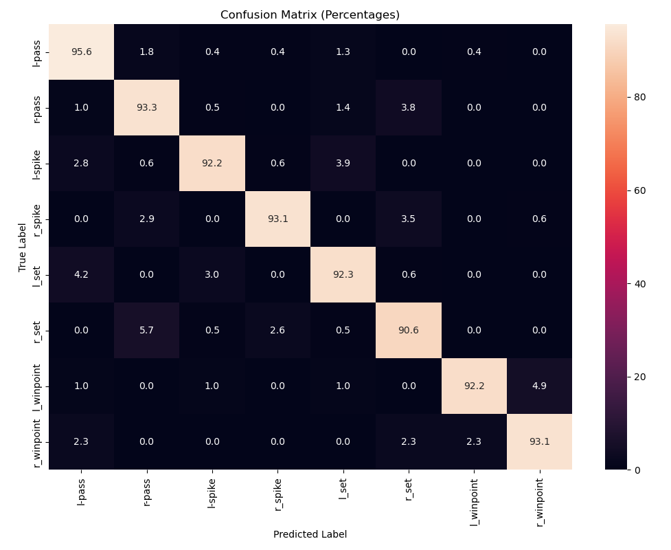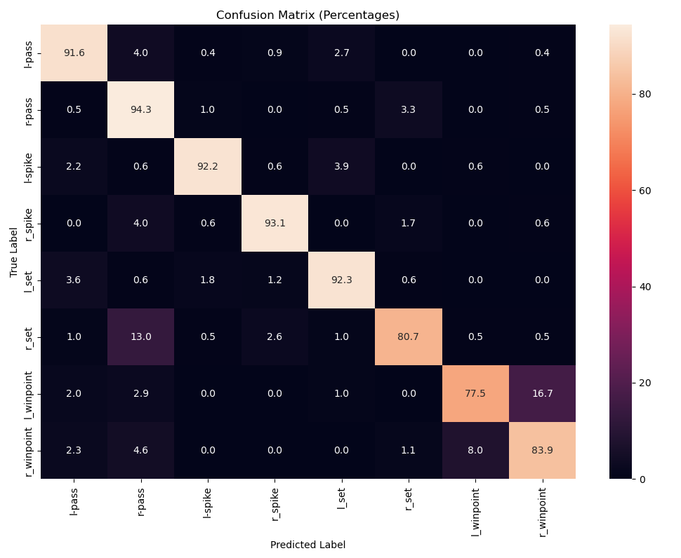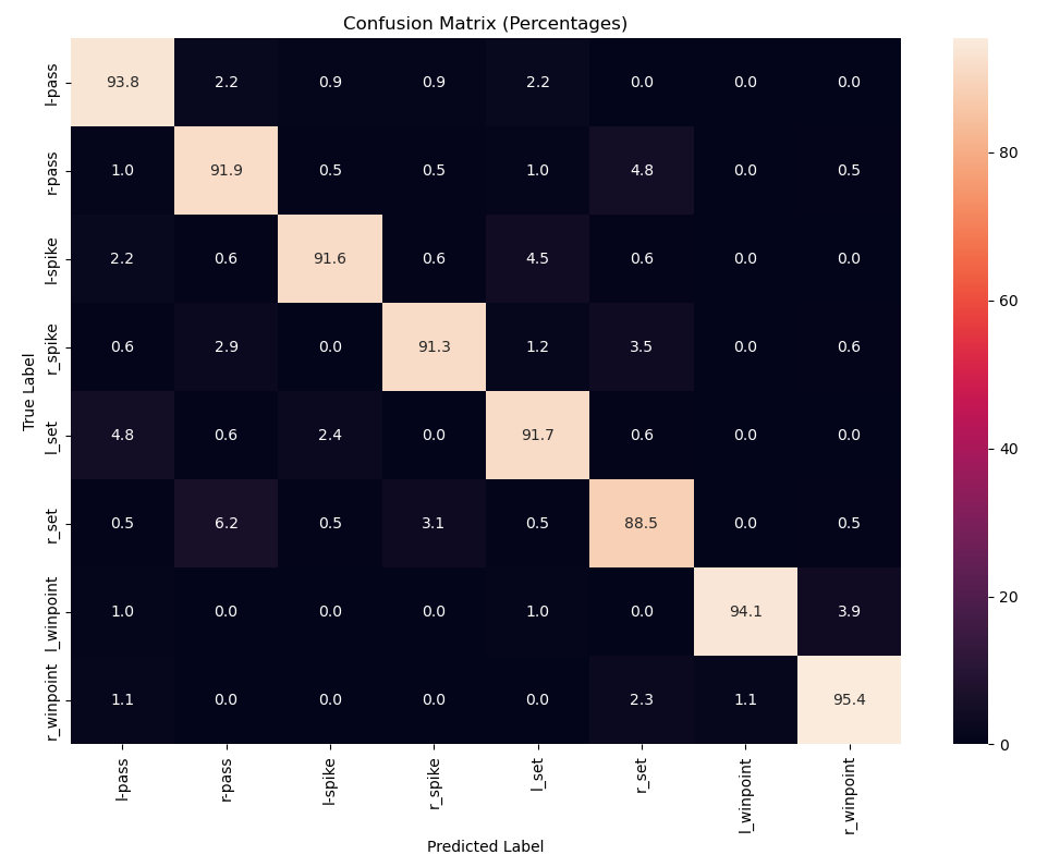 - Spike and pass actions remain dominant at 92–96% accuracy, indicating the success of structured representation.