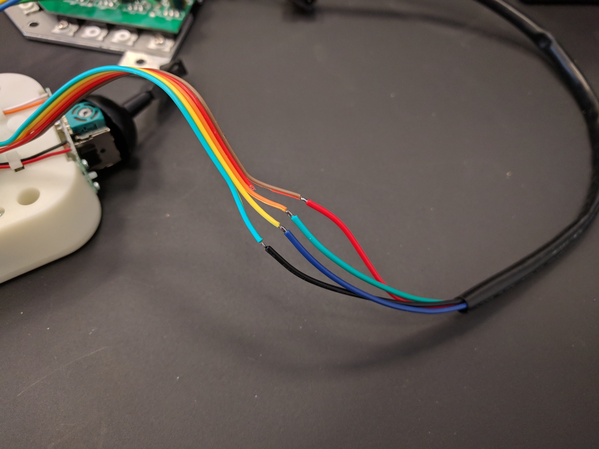 Then separate the individual wires of the flat cable coming from the gametrak, and remove the red wire. Connect the remaining four wires to the four wires of the mainbaord according to this picture: