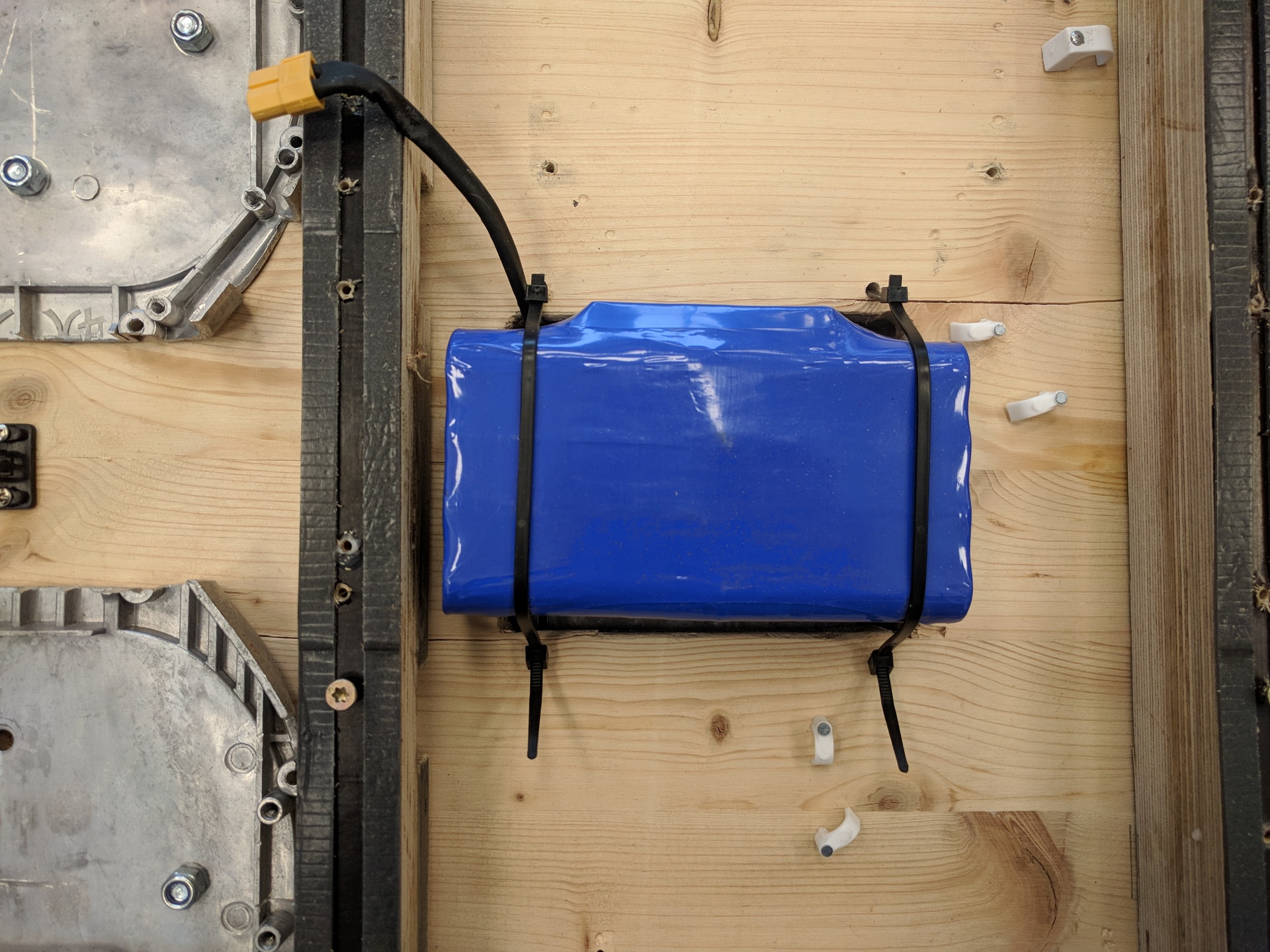 The battery is placed into the fitting battery cutout in the base and fixed in place with cable ties. It should sit loose/shock reistand to prevent it from getting damaged.