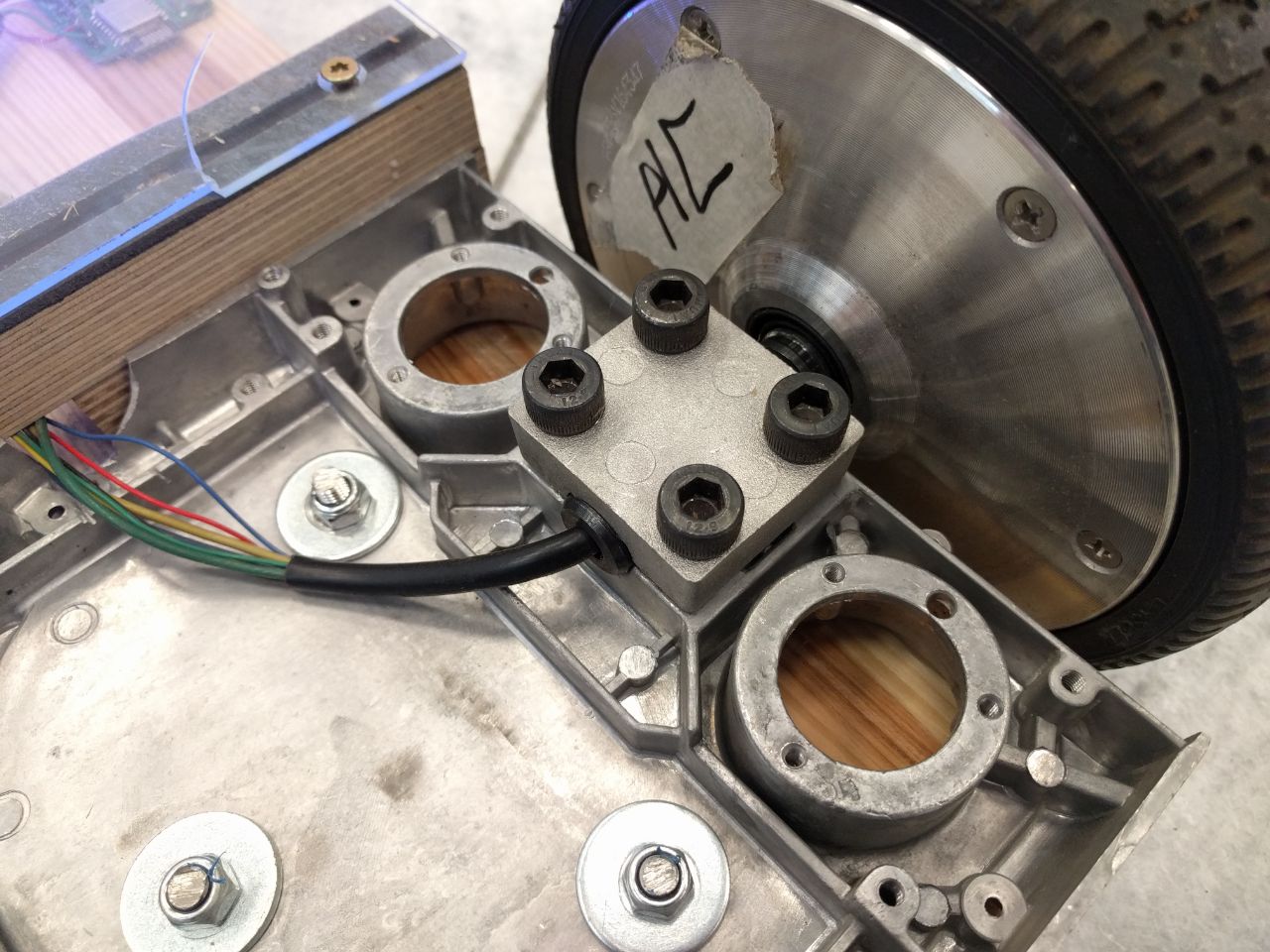 Now the motors and wheels can be mounted to the base. To do this, you will need to drill a few holes accordingly to the mounting holes present in the motor brackets and wheels.