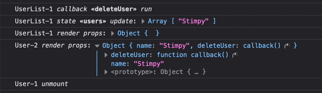 const showProps: ShowProps<UserProps> = { user: ({ name, color }) => `<<${name}:${color}>>` }and in the User component call useTracer({ showProps }).