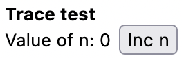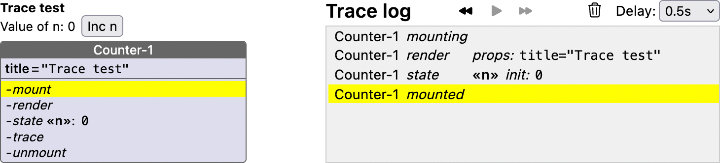 }Now the rendering of <Counter title="Trace test" /> together with the trace log will look like this: