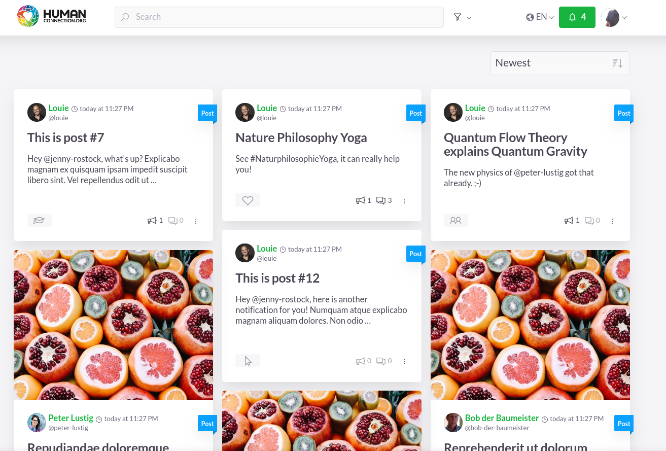 This is how it looks like. @appinteractive I like your styling but I think you don't cover the case that the date is empty, do you? So that's why I went with @alina-beck's suggestion now and moved the date next to the user name. It might happen that the date overflows the post card width on long user names, though. |