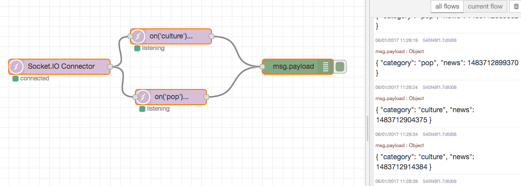 node-red-contrib-socketio-client Nodes Socket.IO Connector Socket.IO Listener How to use Socket.IO Connector -> Socket.IO Listener -> Payload ToDo Socket.IO Server Notice: This module are in developing so, take care when to use in production.
