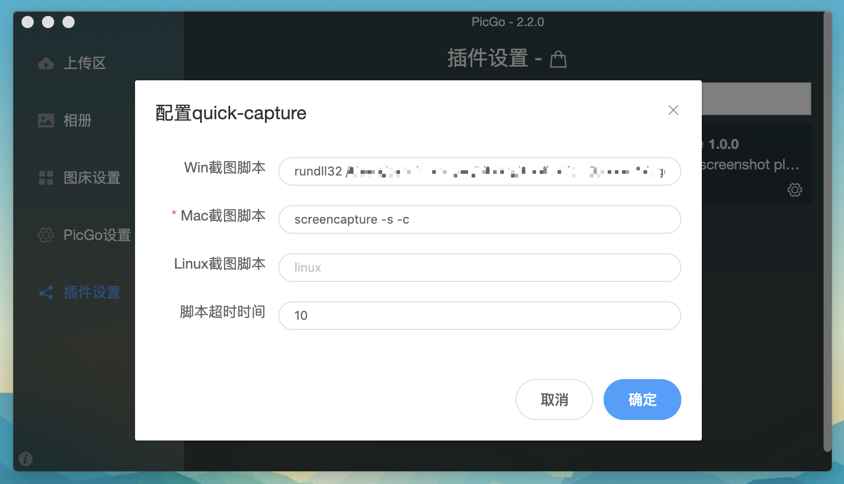 The plugin is configured with screenshot scripts for Windows and MacOS by default. You can also configure your favorite screenshot script.