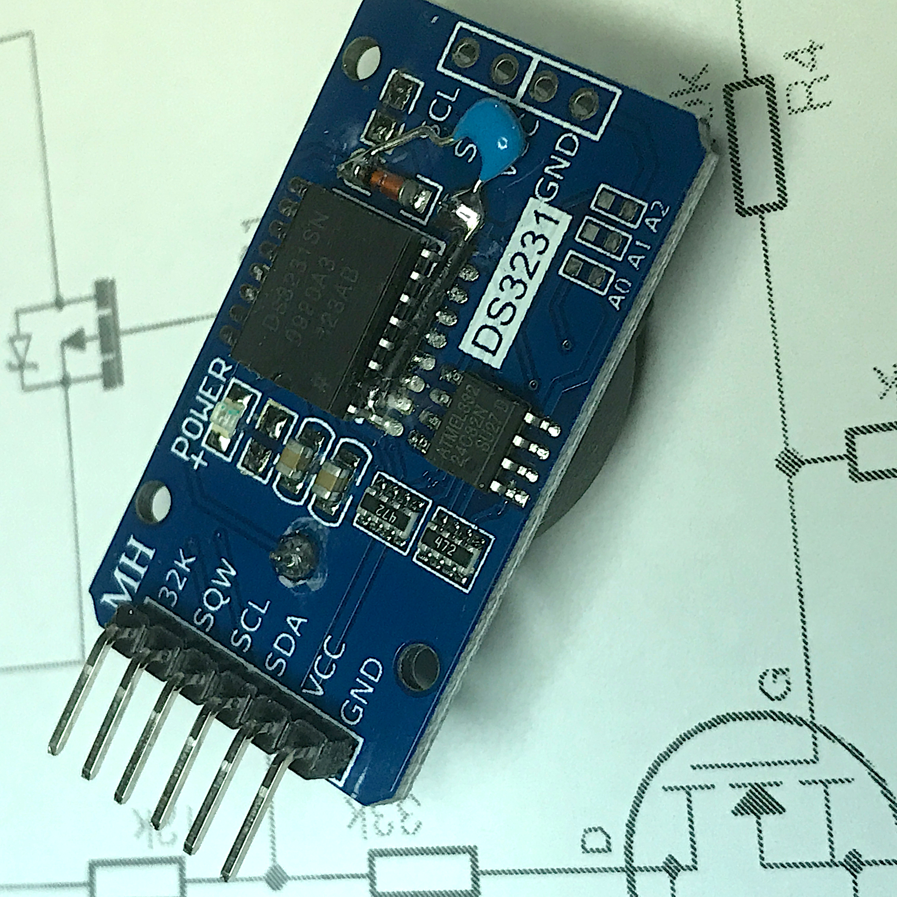 The pads labelled ENAB1/ENAB2 on the bottom left are the connections from the DS3231, which switch the power to the ESP8266 "on" when the DS3231 timer expires and the -INT signal goes low. The DS3231 doesn't require a positive supply from the ESP8266 side of the power switch, as it is modified to run only from the attached CR2032 coin-cell battery (see the photo of the DS3231 below, which has pin-2 VCC cut and wired to ground). If you want to use the 4kB AT24C32 EEPROM on the DS3231 board, you can connect the 3v3 line to the DS3231 module and it will work quite happily (note that when the ESP8266 shuts down, so does the AT24C32, which is normally what you want ...but the DS3231 still ticks along quite happily on it's own coin-cell battery).