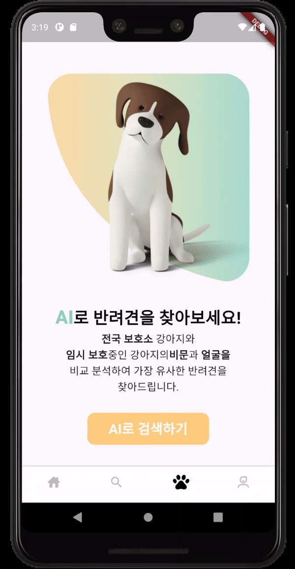 AI로 검색하기 버튼을 이용하여 자신의 반려견과 유사한 반려견을 찾습니다.