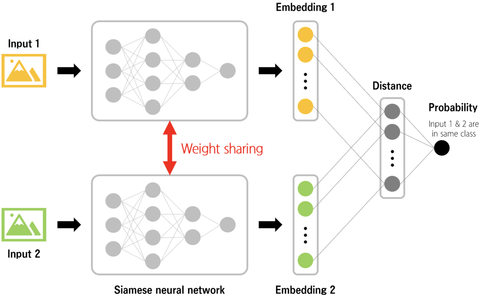- 두 입력 이미지를 각각 처리하는 두 개의 동일한 신경망으로 구성됩니다.