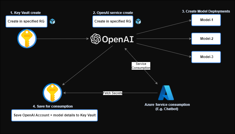 For an example of how to create an OpenAI Service hosted on Azure, deploy Models and saving the details to an Azure Key Vault.