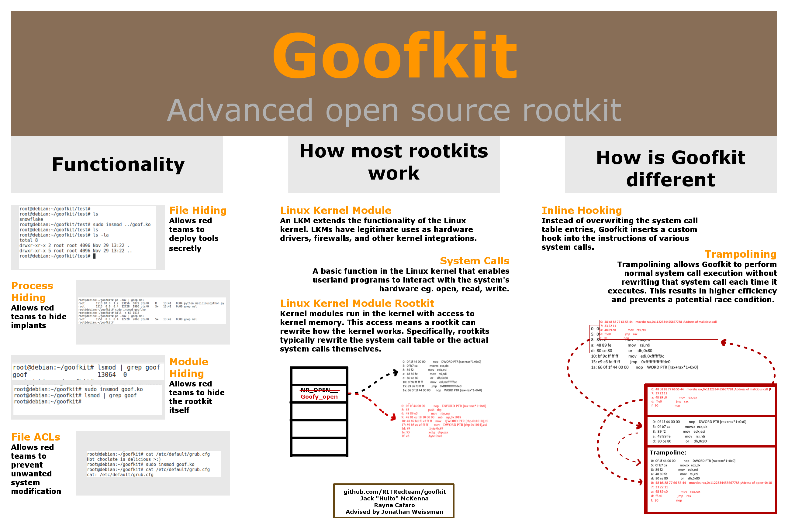 Goofkit is an inline function hooking and trampolining rootkit. Goofkit uses inline hooking and trampolining to create a more robust and better hidden rootkit. Goofkit does not modify the system call table instead it inserts hooks into the system calls itself.