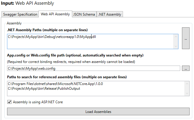 Sample configuration in NSwagStudio for a .NET Core Web API assembly: