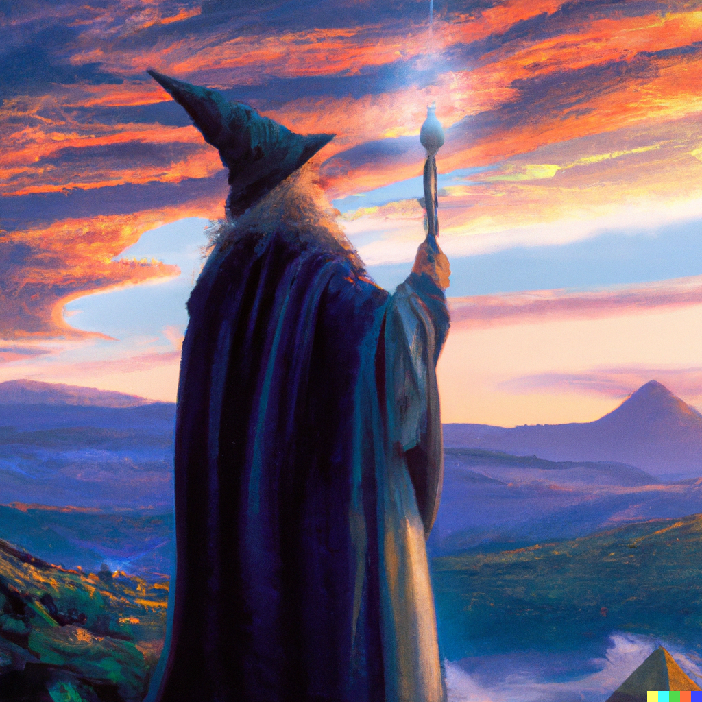DALL-E prompt: A wizard watching over the rising sun atop a tower overlooking mountains and valleys but the wizard is a CLI tool for answering user queries using Microsoft Graph API, artistic, classical landscape painting
