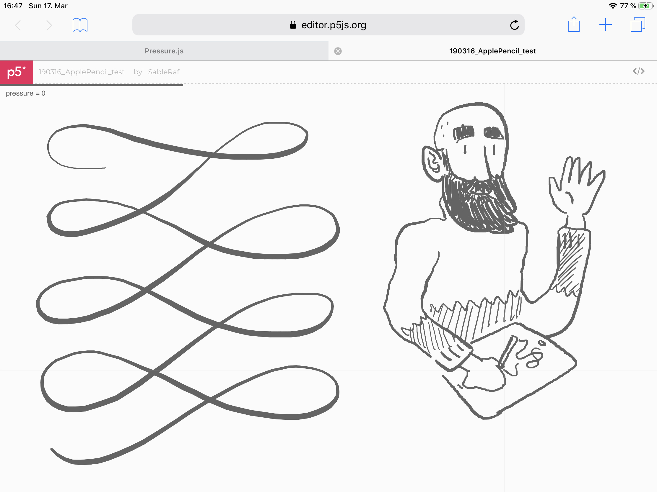 This is a minimal demo of a simple drawing tool supporting the Apple Pencil in iOS Safari. The Apple Pencil support comes courtesy of Pressure.js and all drawing is done using p5.js.
