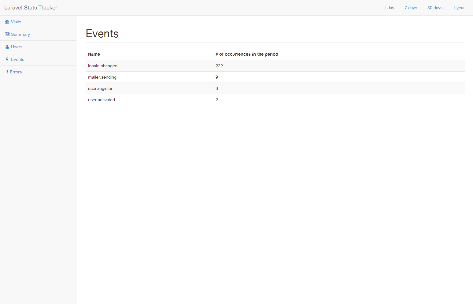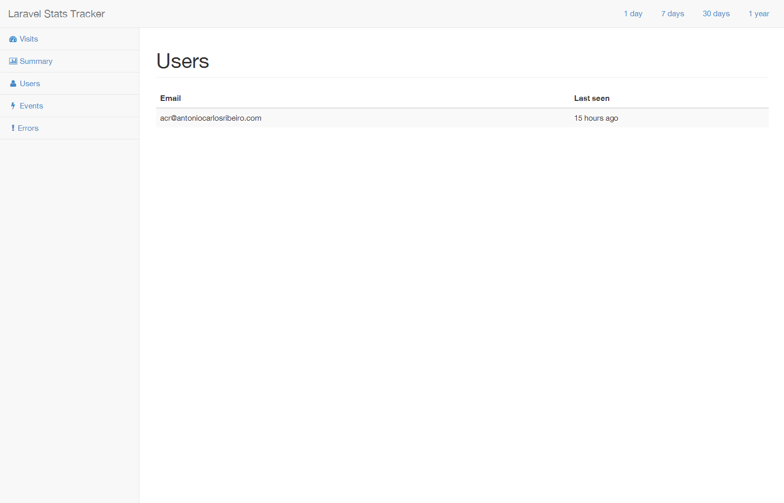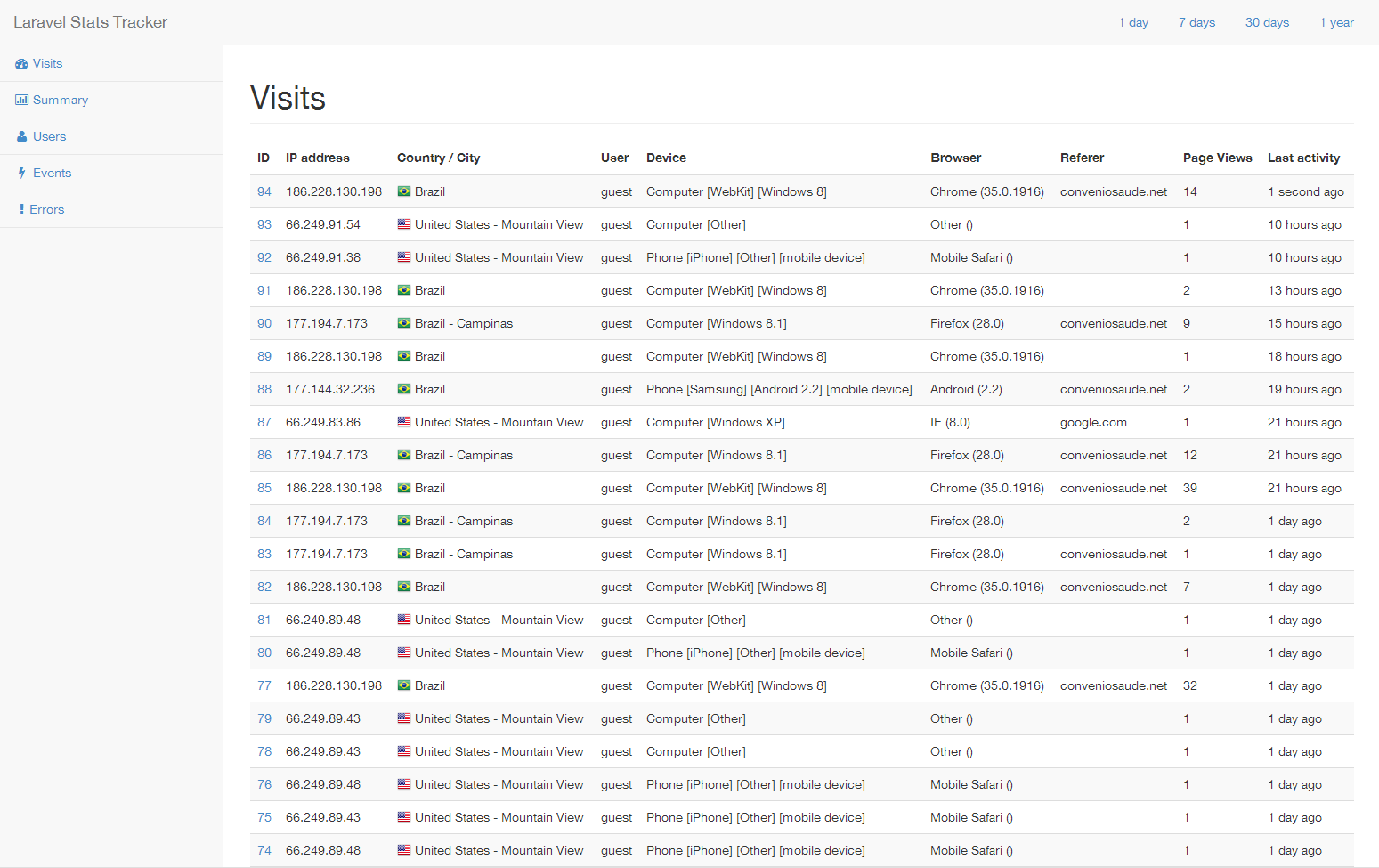 $users = Tracker::onlineUsers(); // defaults to 3 minutes$users = Tracker::users(60 * 24);$users = Tracker::userDevices(60 * 24, $user->id);$events = Tracker::events(60 * 24);$errors = Tracker::errors(60 * 24);$pageViews = Tracker::pageViews(60 * 24 * 30);$pageViews = Tracker::pageViewsByCountry(60 * 24);You can send timestamp ranges to those methods using the Minutes class: