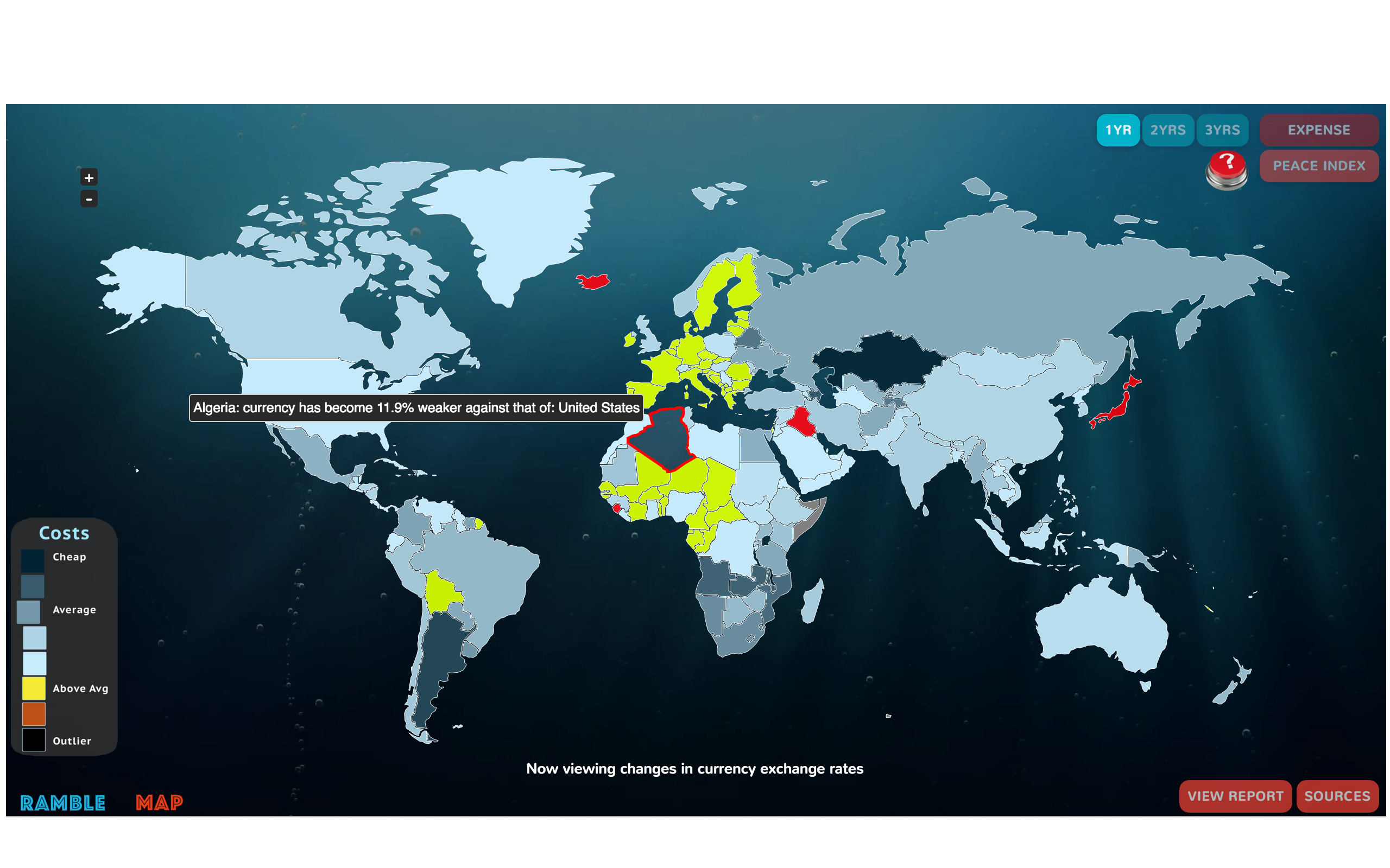 This application, built in Ruby on Rails, is designed to allow users to explore world-wide patterns and trends for exchange rate, expenses, and other datasets. It was built with long-term travelers and expats in mind, people who are interested in getting a bird's-eye view of a region's financial situation.